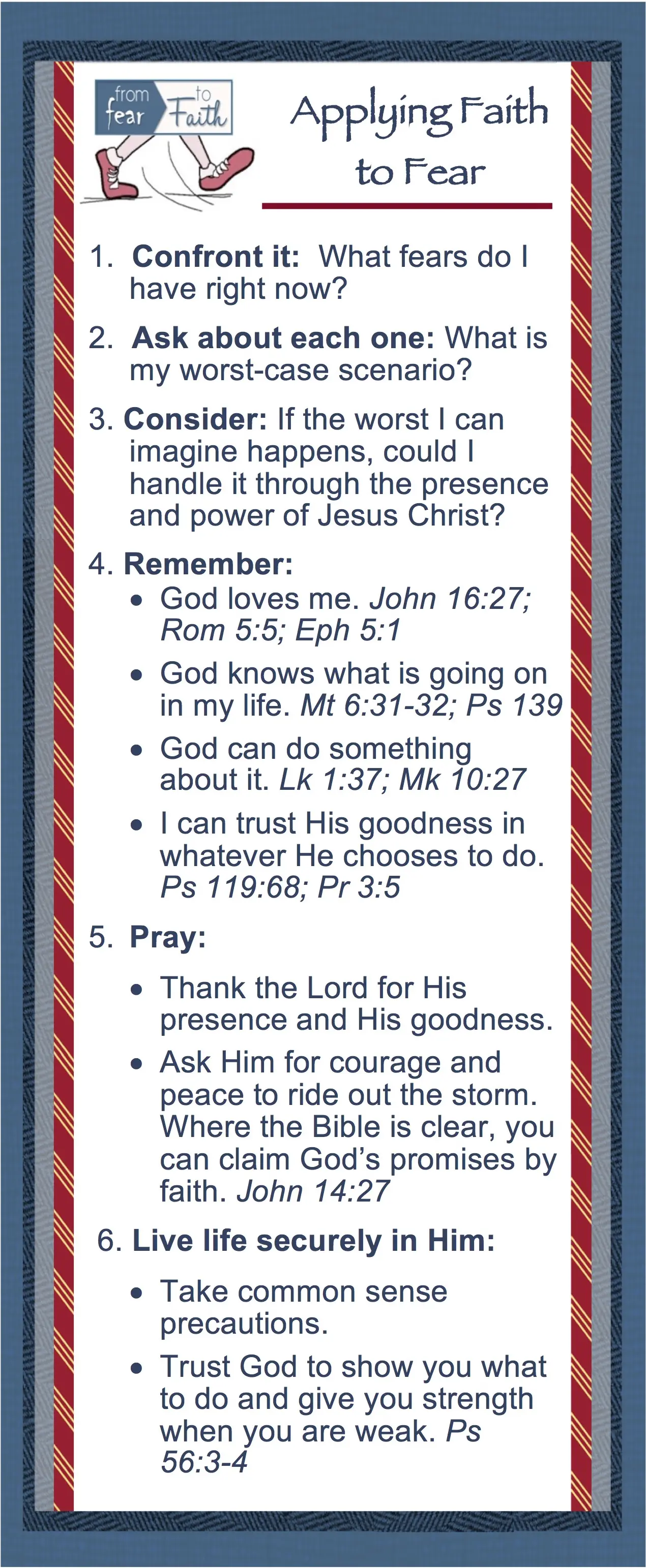 Fear is a normal human emotion designed by God to alert us to danger so that we will take action against it. The Walk from Fear to Faith study will teach you how to do that. This short and easy study looks at 6 Old Testament women who learned how to trust God and overcome their fear. The Walk from Fear to Faith Bible Study will teach you four truths that you can embrace and a process using those four truths to apply faith to any fear in your life. See our FAQs.